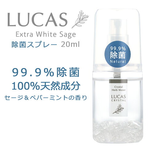 成分 エタノール(100%植物由来:サトウキビ)、精製水、天然精油(ハーブ系:セージ・ペパーミント)、天然水晶LUCAS ハーブ除菌スプレー(除菌率99.9%) 20ml ポケットタイプ(外出用) 〜天然成分のみなのでマスクスプレーや食卓にも安心〜 100%天然成分ながら、除菌率99.9%という強力な除菌スプレーです。
